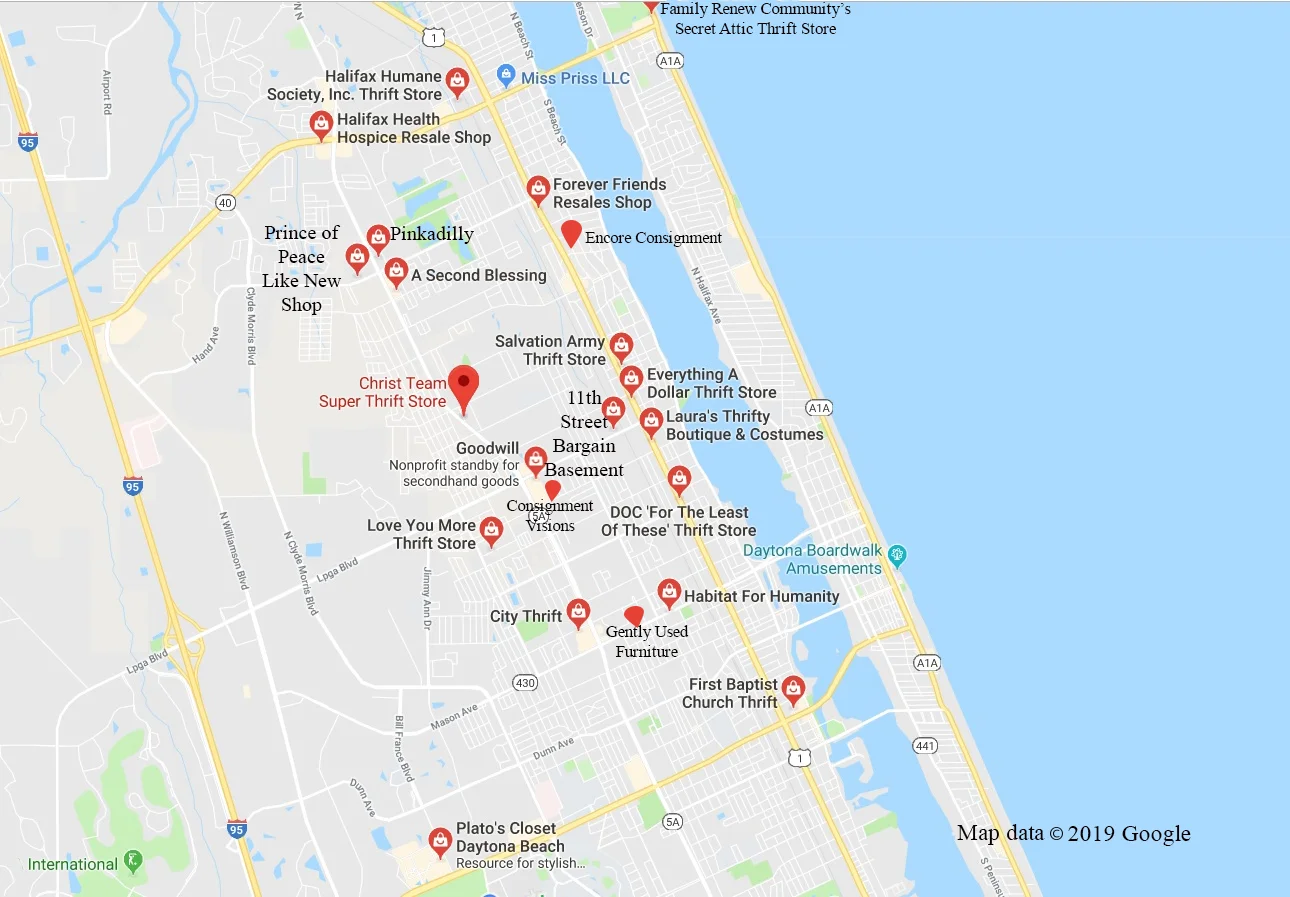 /For less than $12 bucks one can Uber from one end of the ‘thrift store corridor’ in Daytona Beach to the other, but it will cost a bit more if you make stops at each consignment store in between. With more than ten stores of vintage garb in a 2-3 mile radius some may feel overwhelmed with which ones to choose as google and yelp reviews reveal broad accounts for what to expect in these stores. Though one detailed review urges those in search of a clean buy to shop at Family Renew Community Secret Attic Thrift Store with, “The cleanest and well run store. Many good buys and helping families too.” If sticking with ‘what you know’ when thrifting is more your style, like the national chains Salvation Army or Goodwill, lucky for you, they are located within the corridor.